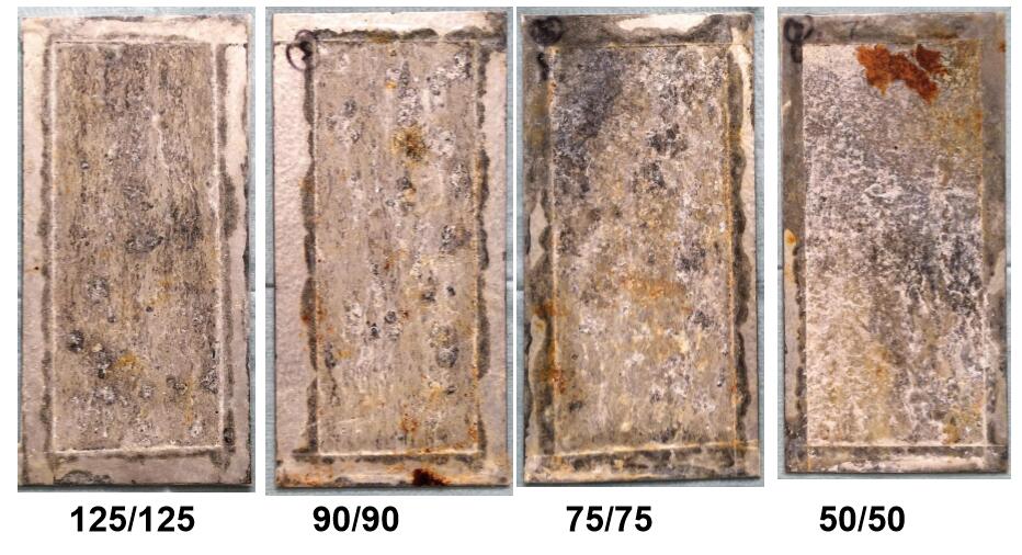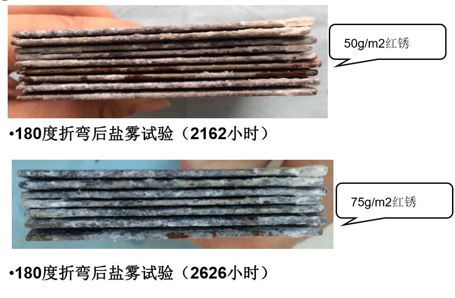 ?封邊鹽霧試驗(2162小時)后,相比50/50g/m2的鍍層產(chǎn)品,厚鍍層產(chǎn)品紅銹面積仍然很低