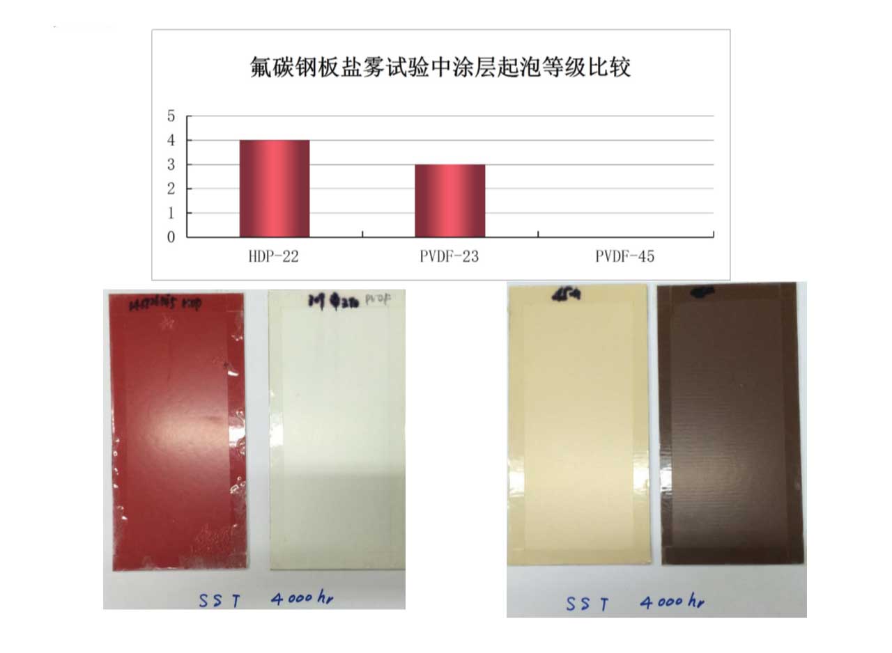 經過4000小時鹽霧試驗后,45微米氟碳產品涂層仍保持0級。