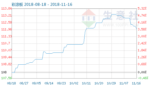 彩涂板商品指數自2018-11-1起,16天陸續(xù)下降了1.156%。